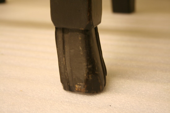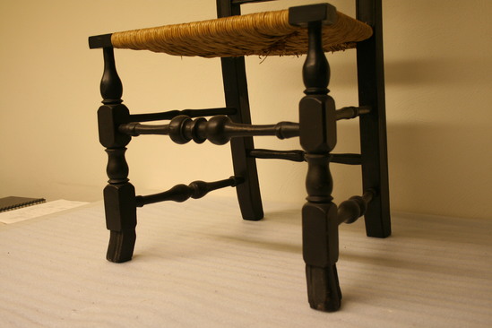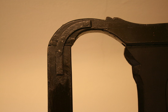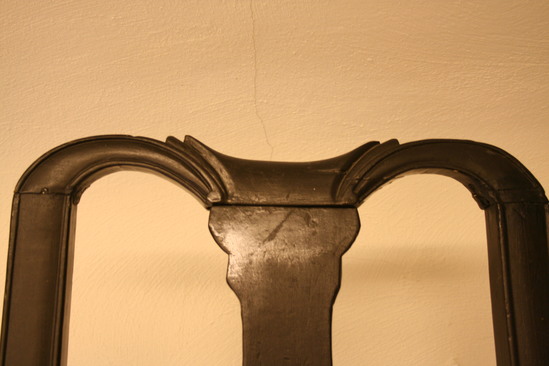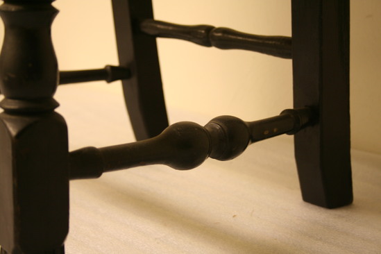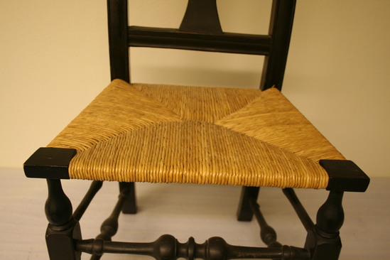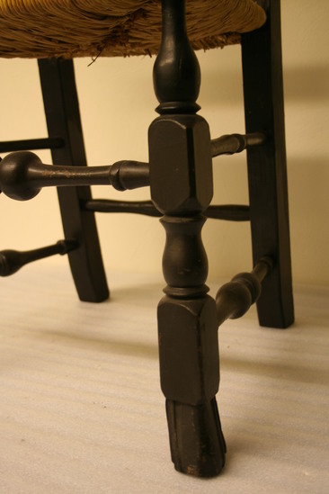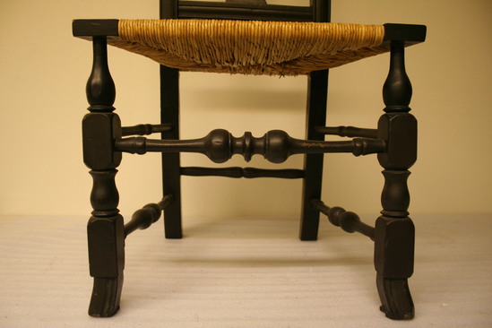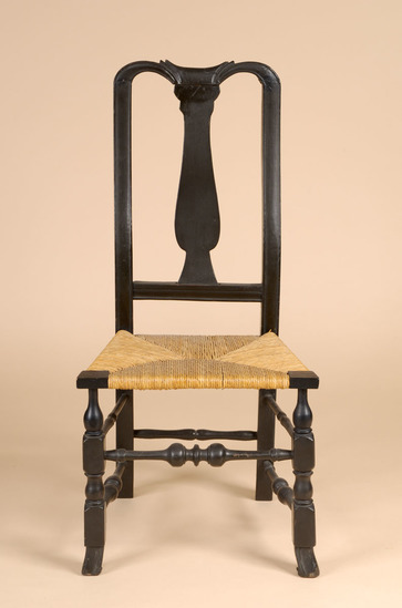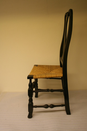 Queen Anne style splat back side chair. Spanish foot. Front legs turned - block, vase, block, ring, bulb with shaft holding seat corner block. Front single stretcher turned with trumpet ends, rings, round to bulb, groove and center ring. Bottom side stretchers plainer verious of front stretcher. Upper side stretchers thinner, very plainly turned with single back stretcher simplest of all. Canted back legs, stiles thumbnail groove edging continuin to bow shaped crest rail with extra grooves towards center. Vase shaped splat seems to have been installed upside down during repairs and painting. Rush seat, not original