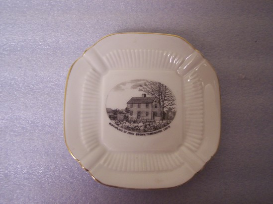 White plate with black transfer of John Brown's birthplace and the words, "Birthplace of John Brown, Torrington Conn." Design is centered on the face of the plate. Plate is square with rounded corners. Gilt edges. Back of plate identifies it as being, "Made in Germany" by or for "Ro: Meara" and "Torrington, Conn." The number "2050 18" is also on the back.