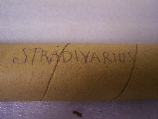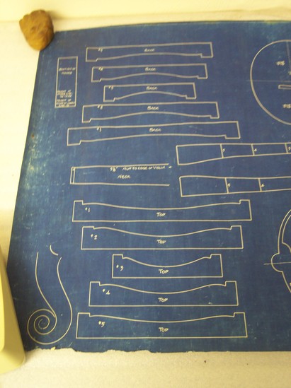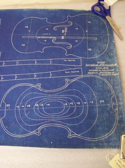 Scaled drawing of a violin. Signed "Elias Howe Co. - Boston" Printed on drawing "Pattern/Joseph Guarnerius/Actual Size Outlines of/Paganini's Guernerius" Used in Fred Dautrich's shop. Evidence of tracing in certain areas, especially on the bridge