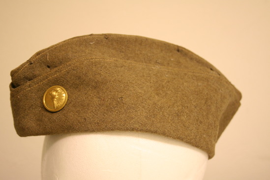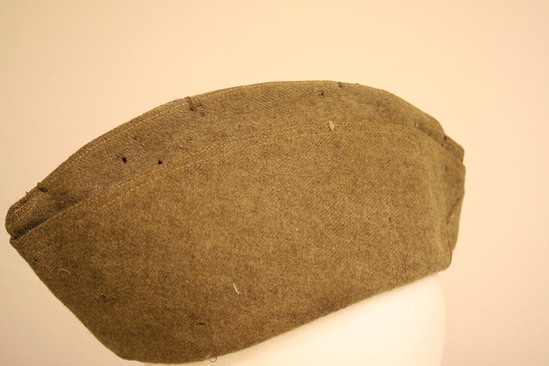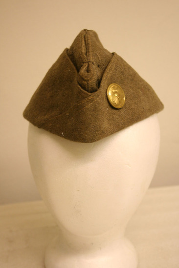 Olive drab garrison cap, World War II era. Folds flat with height less in front than back; on side, near front is circular gold pin with torch in front of starburst design (Torch of Knowledge insignia worn by ROTC cadets); hat has no lining and small cotton band on inside.