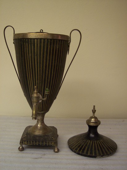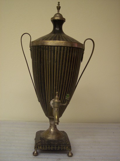 4 round knob feet of silver plated copper. Base square with four steps to flat top - decorated with black lacquer and double yellow stripes. Base of urn is silver plated copper in round stepped tapered to narrow neck and flared to bottom of urn with vase shaped and painted black with double yellow stripes. Grooved handles on either side start 3/4 way down and curve over to form leaf tab - all of silver plated copper. From bottom of vase part grooved plated brass spout with elbow petcock having green ivory finial. Neck of vase is grooved silver plated copper. Shallow cone top painted to neck with flared top and pierced silvered dome with vase finial. Inside is cylinder with top for hot piece of iron now missing.