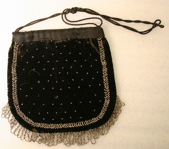 Square piece of black velvet with rounded corners and black satin top band which has black cording for tie/strings. Steel bead border and fringe with groups of two steel beads scattered over ground. Black satin lining.