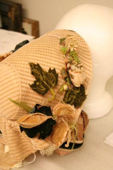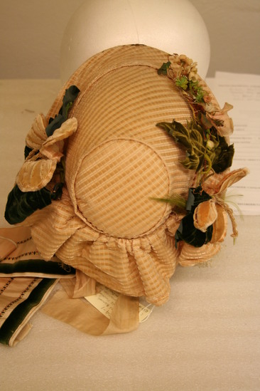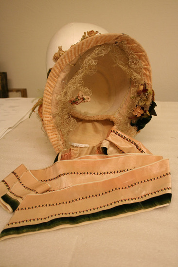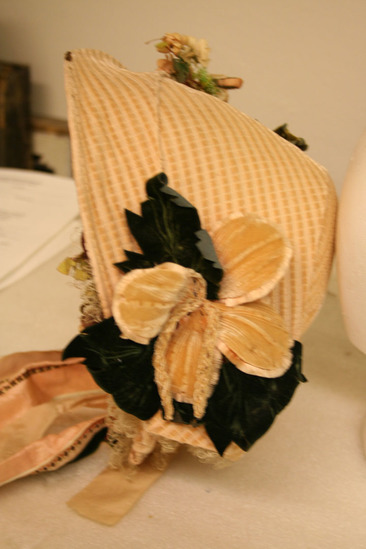 Pink textured velvet bonnet; lopsided cone shape; inside brim trimmed with white lace and small, pink cloth flowers; large pink velvet flower with green velvet leaves on right and small cloth flowers with velvet leaves on left; pink ribbons with green velvet trim in front