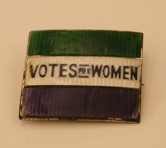White metal square pin with horizontal enamel bars on front of green, white and purple with "Votes for Women" in black across white center band.