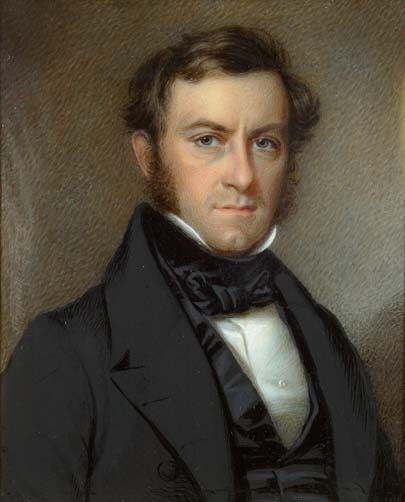 Full face, head and shoulders of a middle aged man with long brown hair and sideburns. Brown eyes. He wears a black coat, black silk vest, high collar with black neck banc and wide bow and white shirt. Background is stippled. Frame: Square gold frame with gold metal mat inside glass. Has loop for hanging. Metal back panel slides out from top.