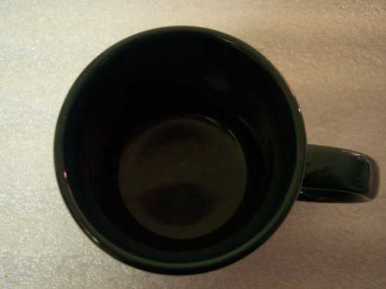 Earthenware coffee cup with dark green glaze. Marked "Celebrating/150/years/Litchfield Bancorp." Design is in tan, and produced by removing the green glaze to show the tan clay underneath. Where the base touches the table or resting surface is also unglazed. "3421" is impressed into the base.