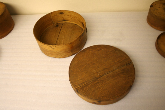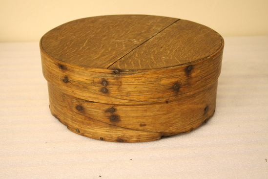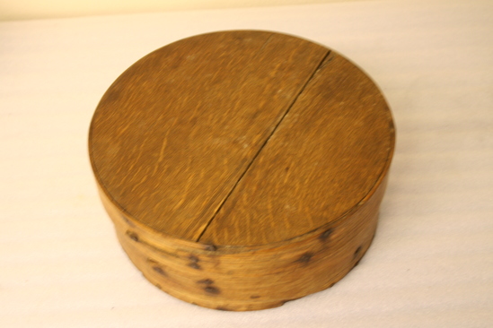 Round bentwood box with lid. Likely used for food storage. Side of container cut to a point and riveted together with handwrought tacks. The round top and bottom were also fastened with handwrought tacks but most of them have been replaced with flat-headed tacks.