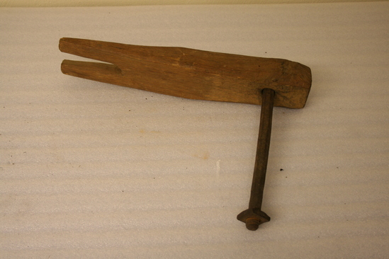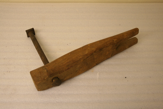 Rectangular block of wood. Once end has V shaped voide in end. At other end is a round piece of iron protruding from block perpendicular.