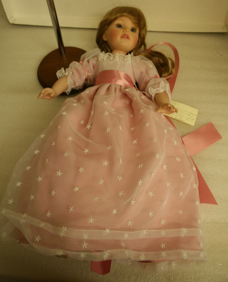 A - Doll - long curly stylized ash blond hair with bangs, pulled back with pink satin ribbon in back. Blue eyes. Plastic head and body. Reticulated at shoulders and thighs, specially reticulated at knee with fabric joint to allow doll to sit. The doll wears a pink polyester underdress, sheer white overdress of polyester with embroidered star pattern overall. Wide pink satin ribbon at waist, square neckline with ruffle of white lace. 3/4 length sleeves, pink ribbon of elbow level, white lace ruffle at end. White cotton petticoat with bodice attached, white cotton pantaloons, white polyester leggings and pink shoes. Stamped on base of doll's head "1991 Susan Wakeen/Doll Company/Inc." B - Doll comes with a wooden and metal stand allowing doll to stand upright.