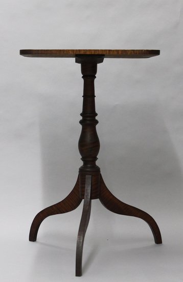Tiger maple candlestand - rectangular shaped top screwed to base. Turned cetner pedestal with vase shape in center. 3 legs with no feet.