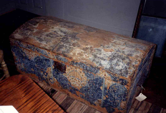 Wooden dome lid trunk, very large, covered with blue block print figured paper c. 1800. Iron handle on each side, lock on front