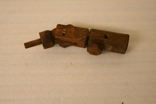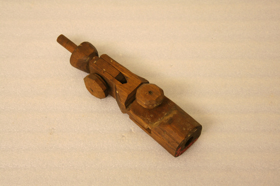 Attachement for a plane table. Three pieces of wood. Hinged in two different directions - end pieces rotate in opposite directions from each other. One end circular with hole in center, opposite end has round shaft protrusion. Two wooden screws for tightening hinges to hold angles in place.