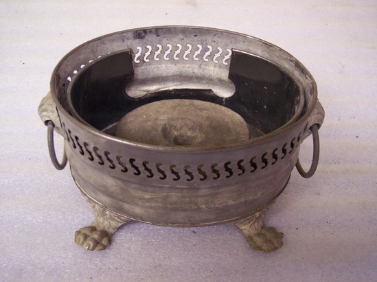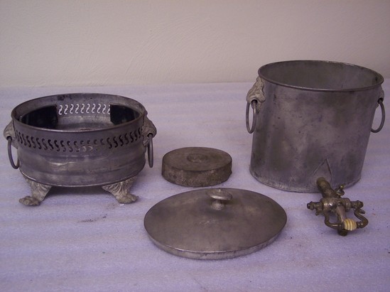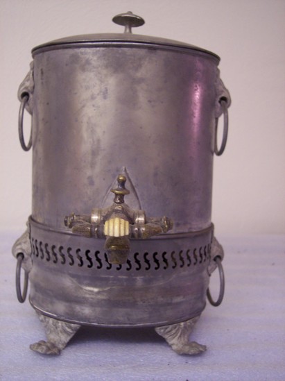 Oval in basic shape. Four tin lets of animal paws with geometric design at top. Oval base with S pierced band at top and holder inside so top part does not drop in too far, heavy piece of oval cast iron as heater inside. On either side are cast leaf holders for rings. Top plain oval with same ring and knob at top. Shallow dome top with button finial. Teardrop plate in front from which emerges knobbed spout with fancy U handle valve with ivory knob in center half missing