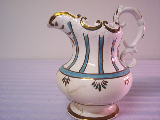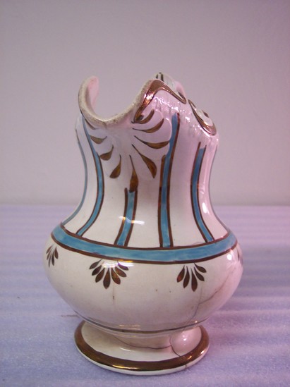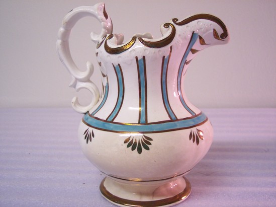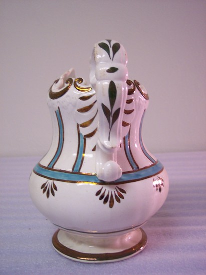 White pitcher with copper luster band around its round base. Fat body with copper and green luster decorations in vertical lines with leaves at the bases of the verticals. C-scroll top with incised leaf decoration. Copper luster double C-scroll handle with copper luster decorations.