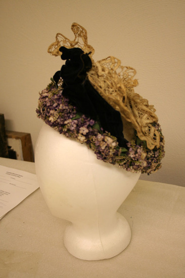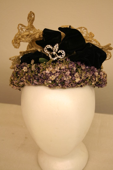 Shallow crescent shaped hat; thick trim of small violet silk flowers; black velvet bow in front with rhinestone - almost fleur de lis in shape; crown covered in whtie lace; interior of white silk; label "Mme Cecile Jeannot - Importer/125 Fifth Avenue New York"