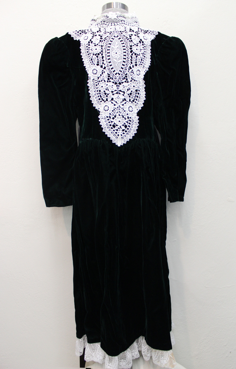 Dark green velvet girl's dress. Fitted bodice with V at center front. White embroidered lace band collar. White embroidered lace bib on center front bodice. Long sleeves. Shoulder pads. Full gathered skirt with white Valenciennes lace ruffle at hem. Attached satin ribbon tie belt. Center back zipper. White button and loop closure at center back neck. Size 6. Labels: JESSICA McCLINTOCK; care instructions.