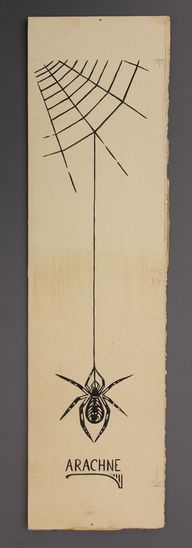 Illustration on board executed in pencil and black paint. Artwork depicts a spider having from a web.