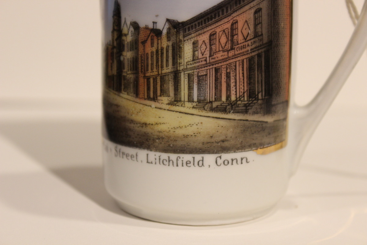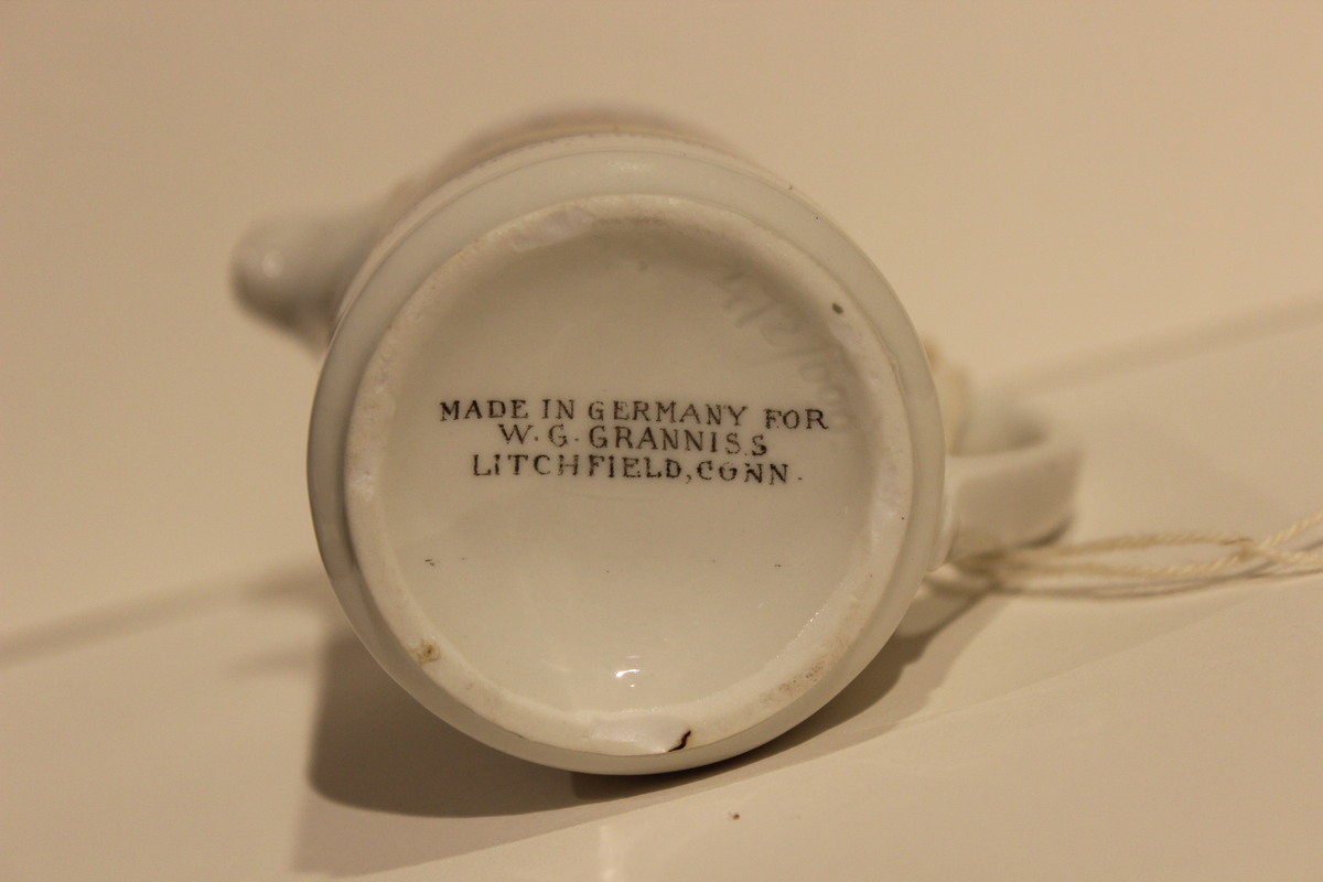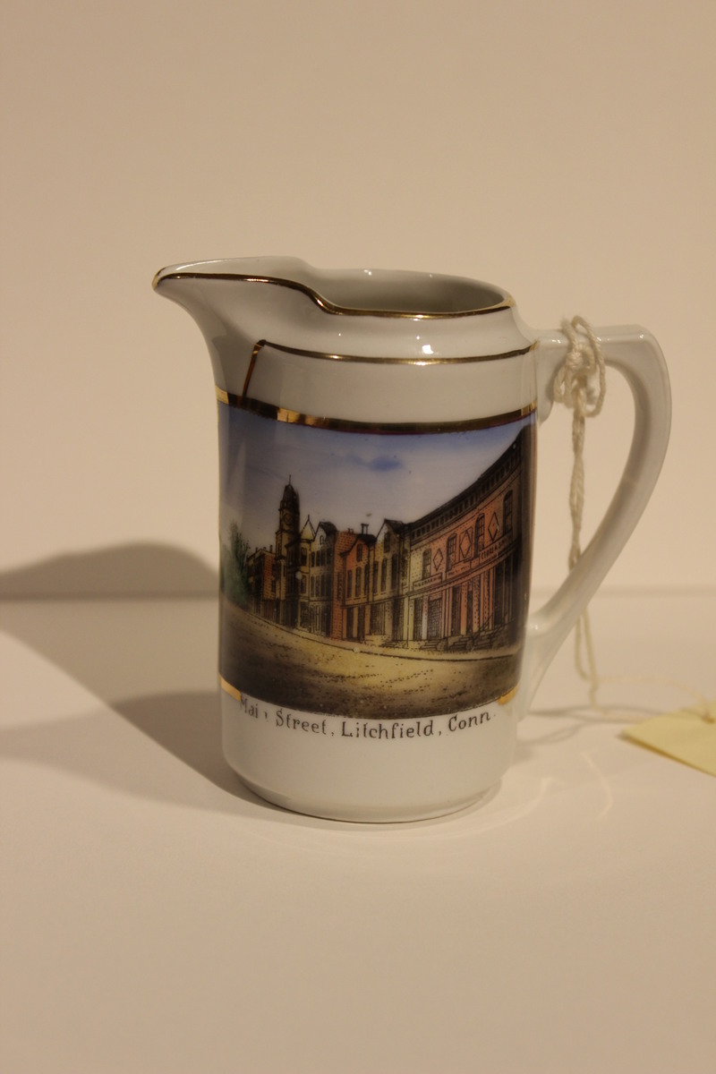 Small white ceramic creamer with single-bend handle and color, transfer-printed image of West Street businesses. Image shows Litchfield Country Courthouse, W. G. Granniss store, and George A. Smith's store, among others without distinguishable identification. Gold decoration bordering image and spout. Printed underneath image is "Main Street, Litchfield, Conn." in black lettering. Bottom of creamer is marked "MADE IN GERMANY FOR/W. G. GRANNISS/LITCHFIELD, CONN." in black printed lettering, and the numbers "34" and "472/000" in incised lettering.
