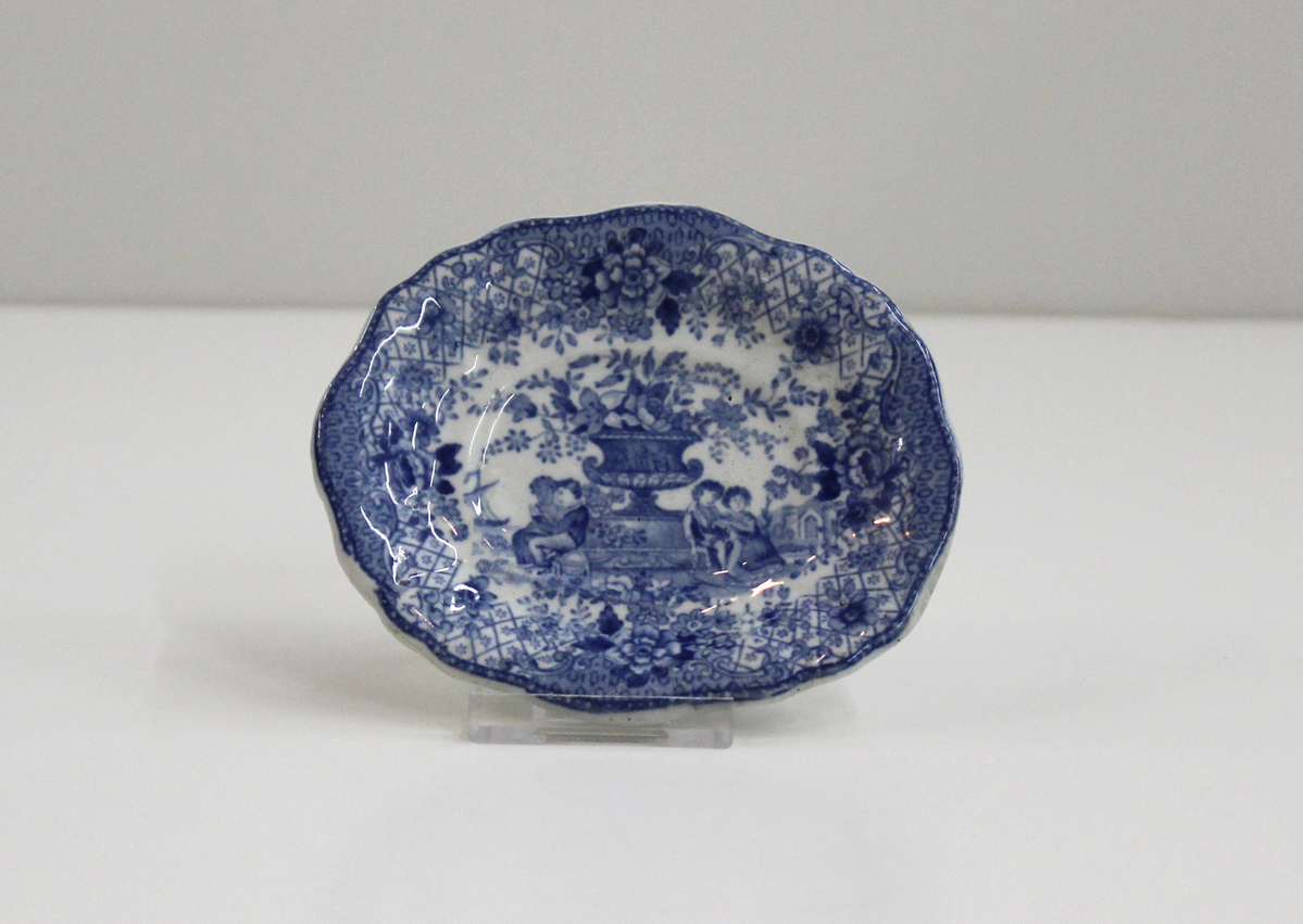 Glazed earthenware platter used as a toy or play teaware. White ceramic with blue transfer-printed decoration. Platter features an image of four children seated by a large urn which holds a cluster of flowers and plants. There is a castle visible to the far right and a boat to the far left. Around the rim is a border of geometric designs adorned with flowers and acanthus leaves. Scalloped edge. Two small triangular impressions in bottom.