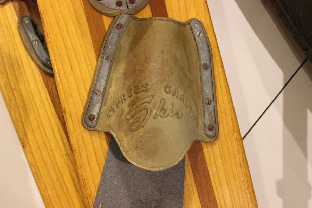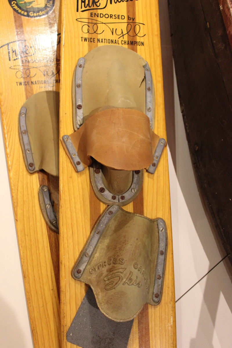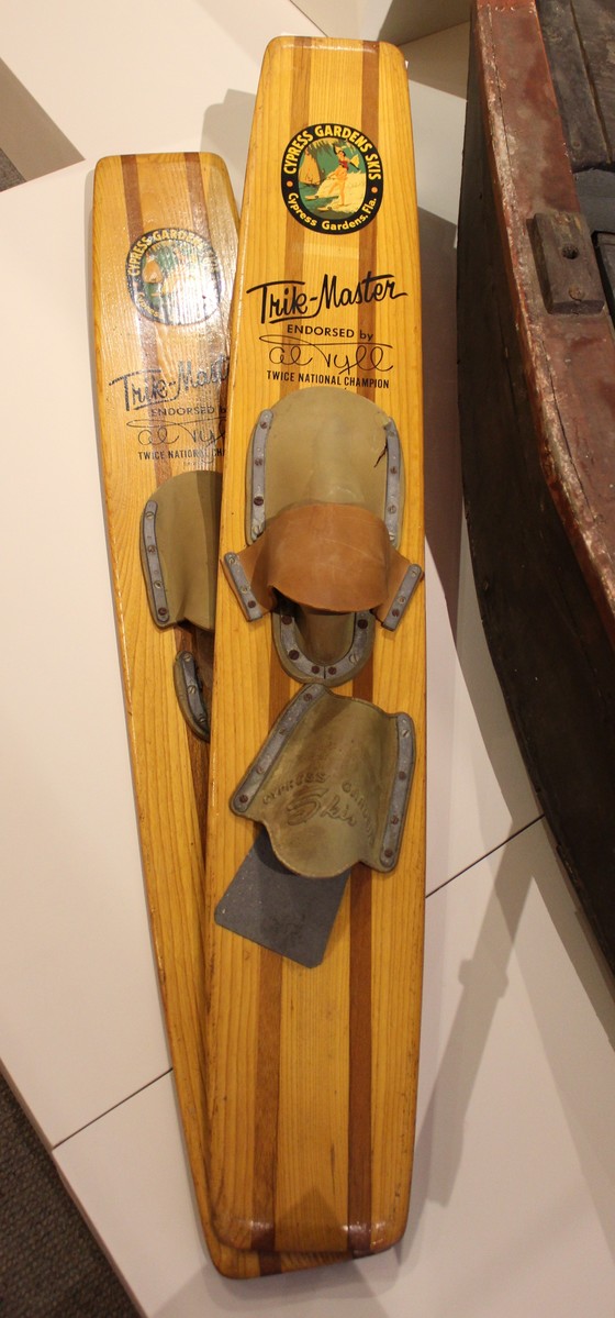Pair of trick water skis manufactured by Cypress Gardens Skis of Cypress Gardens, Florida, and endorsed by Al Tyll. Skis are made of two different woods, with three wide planks of a light yellow wood separated by narrow strips of a dark brown wood. Skis taper slightly at the front and back, and have beveled edges (more pronounced at the ends). The bottom of the skis are painted a red-orange color. Both skis have an adhesive graphic of a man water skiing with a woman on his shoulders, as well as the text "CYPRESS GARDENS SKIS/Cypress Gardens, Fla." The text "Trik-Master/ENDORSED by Al Tyll/TWICE NATIONAL CHAMPION/TM-21-A" engraved in black underneath, with "Al Tyll" styled after Tyll's signature. One ski has two bindings; the back binding is original to the ski and is marked "CYPRESS GARDENS/Ski," and the front binding is a two-piece of grey and red rubber. The other ski has a single, two-piece binding of grey rubber, with the rear piece cracked and misshaped.