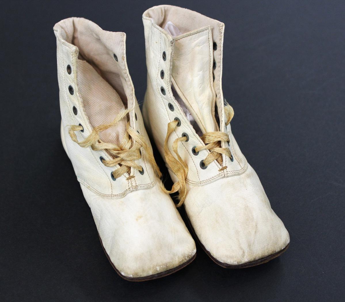 Pair of white leather child's shoes / boots; square toes; lace-up front with metal eyelets; tan silk laces; white cotton twill tongue and lining; tan leather soles
