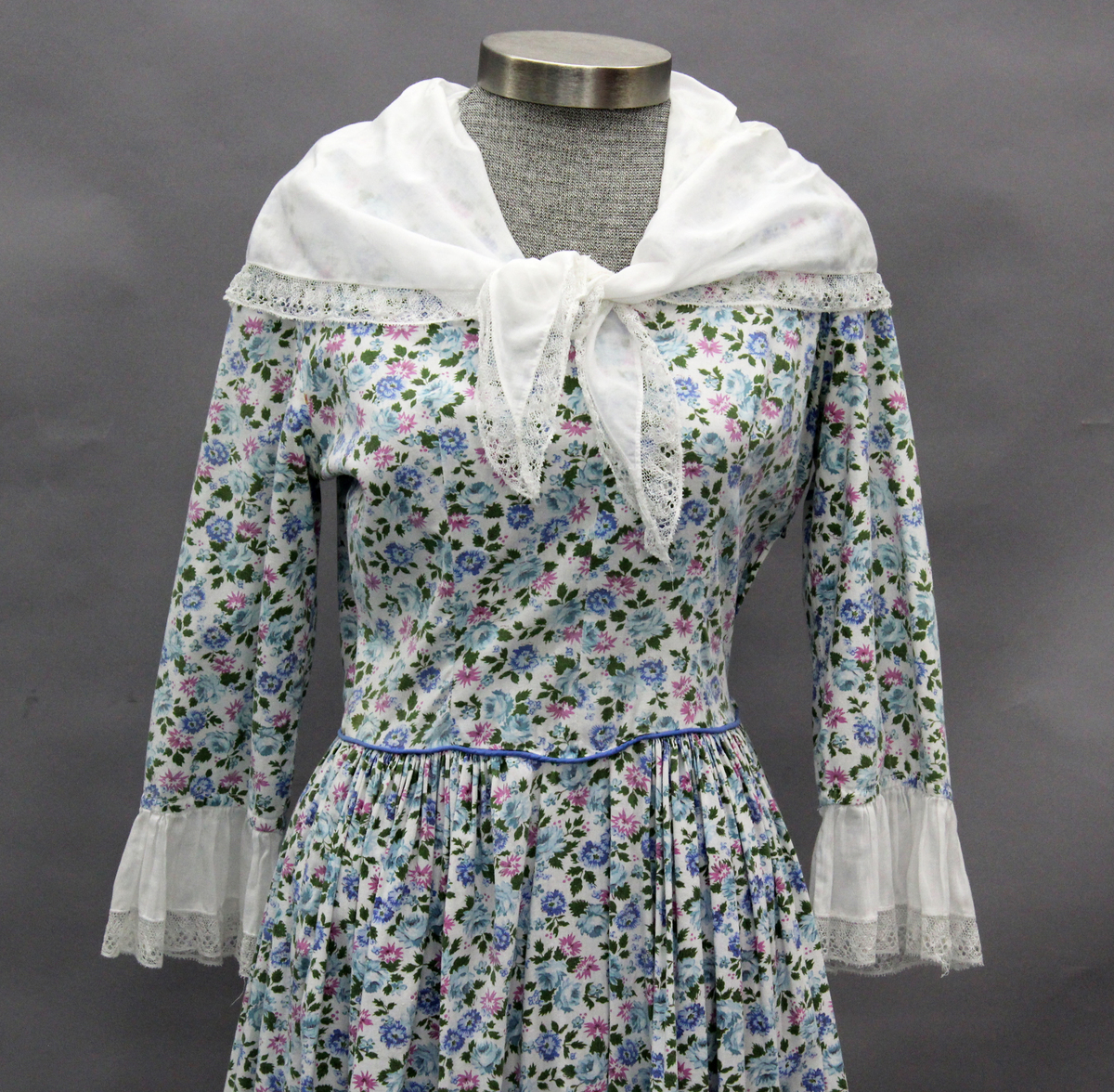 Blue and pink printed floral cotton dress, done in an 18th-century style. Fitted bodice, blue piping at waist. Three-quarter-length sleeves with sheer white cotton ruffle with lace edge. V-neck with white sheer cotton fichu-style collar with lace edge. Long gathered skirt with metal zipper at left- side seam. Blue hem seam binding.