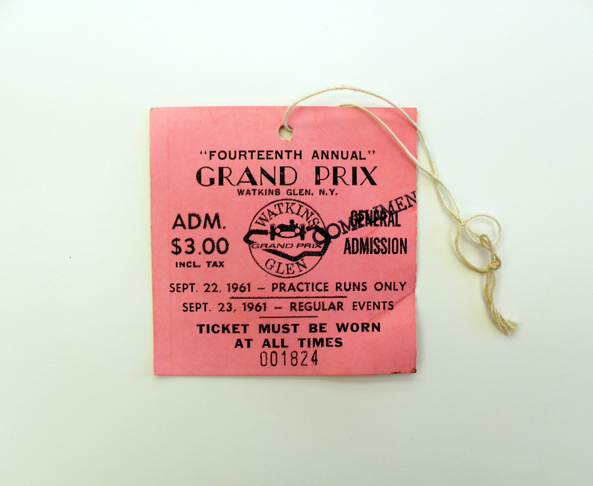 Printed general admission pass for the 14th Annual Grand Prix of Watkins Glen (September 22-23, 1961). Pink cardstock with printed lettering on both sides. Logo for Watkins Glen International race track with information about timing for the practice and regular events; admission price; ticket number; and spectator warning. Hole punched at top with white string tied in loop.