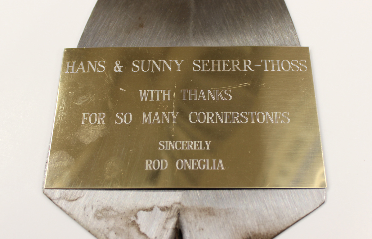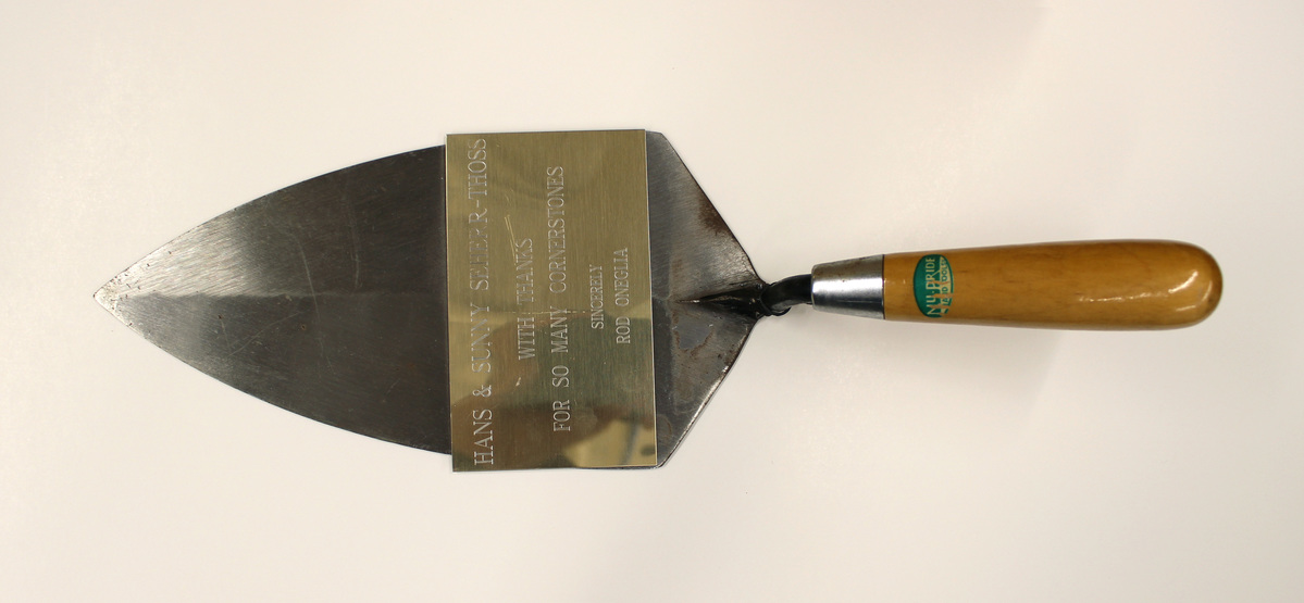 Large trowel (a) with commemorative plaque (b). Triangular stainless steel blade terminating in a sharp point. Blade tapers at the other end to join with handle. Slight s-shaped iron arm joins blade to wooden handle, with silver metal ring connecting the two. Green and white oval-shaped sticker on handle with text, "Nu-Pride/HAND TOOLS." Previously affixed to blade is an engraved metal plaque, gold-colored, with text "HANS & SUNNY SEHERR-THOSS/WITH THANKS/FOR SO MANY CORNERSTONES/SINCERELY/ROD ONEGLIA."