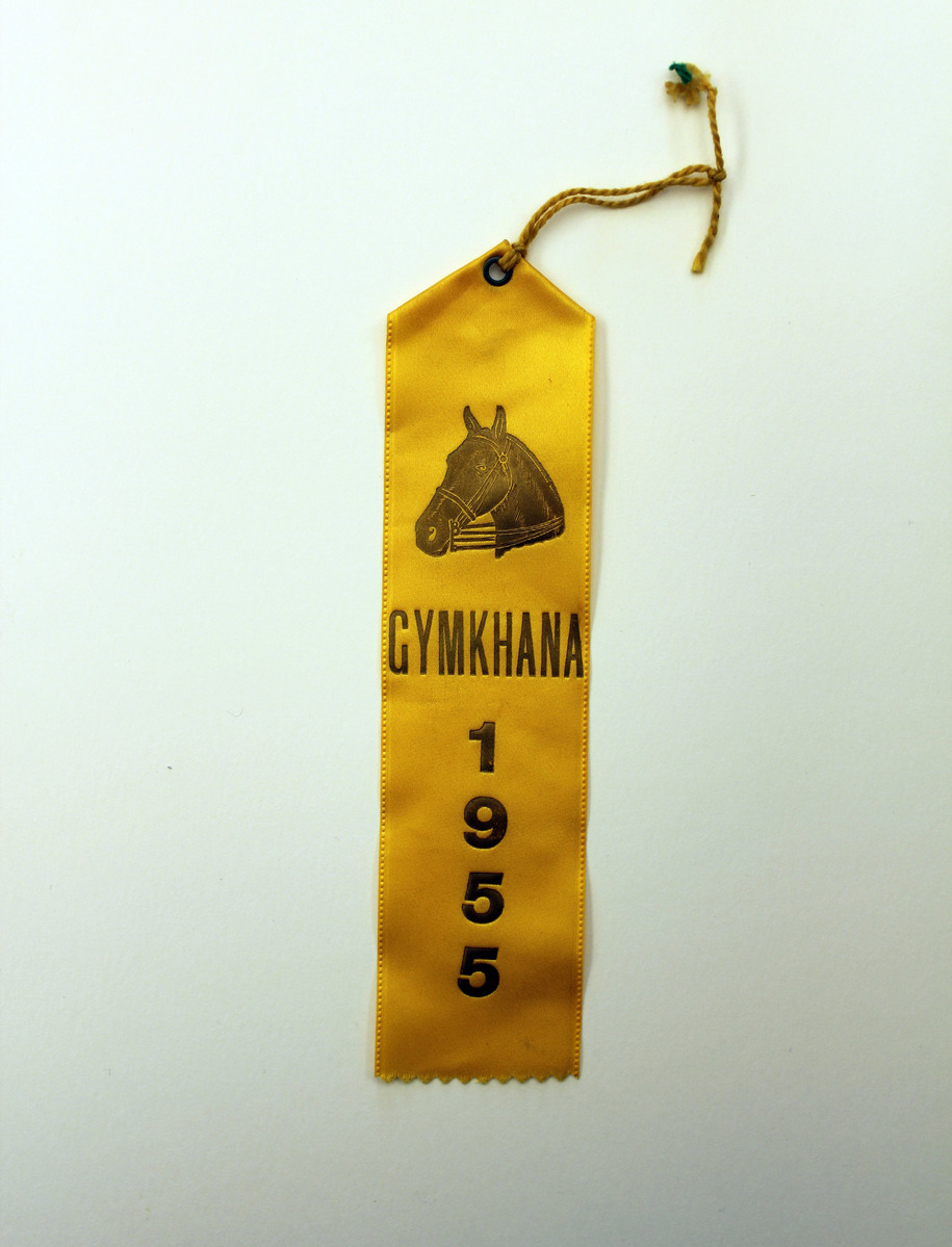 Yellow satin ribbon with triangular fold and metal eyelet at top. Printed on one side in gold ink is image of a horse's head with lettering, "GYMKHANA/1955." Yellow thread strung through eyelet.