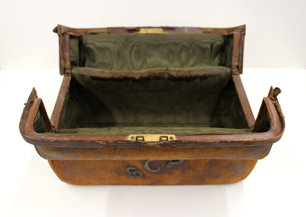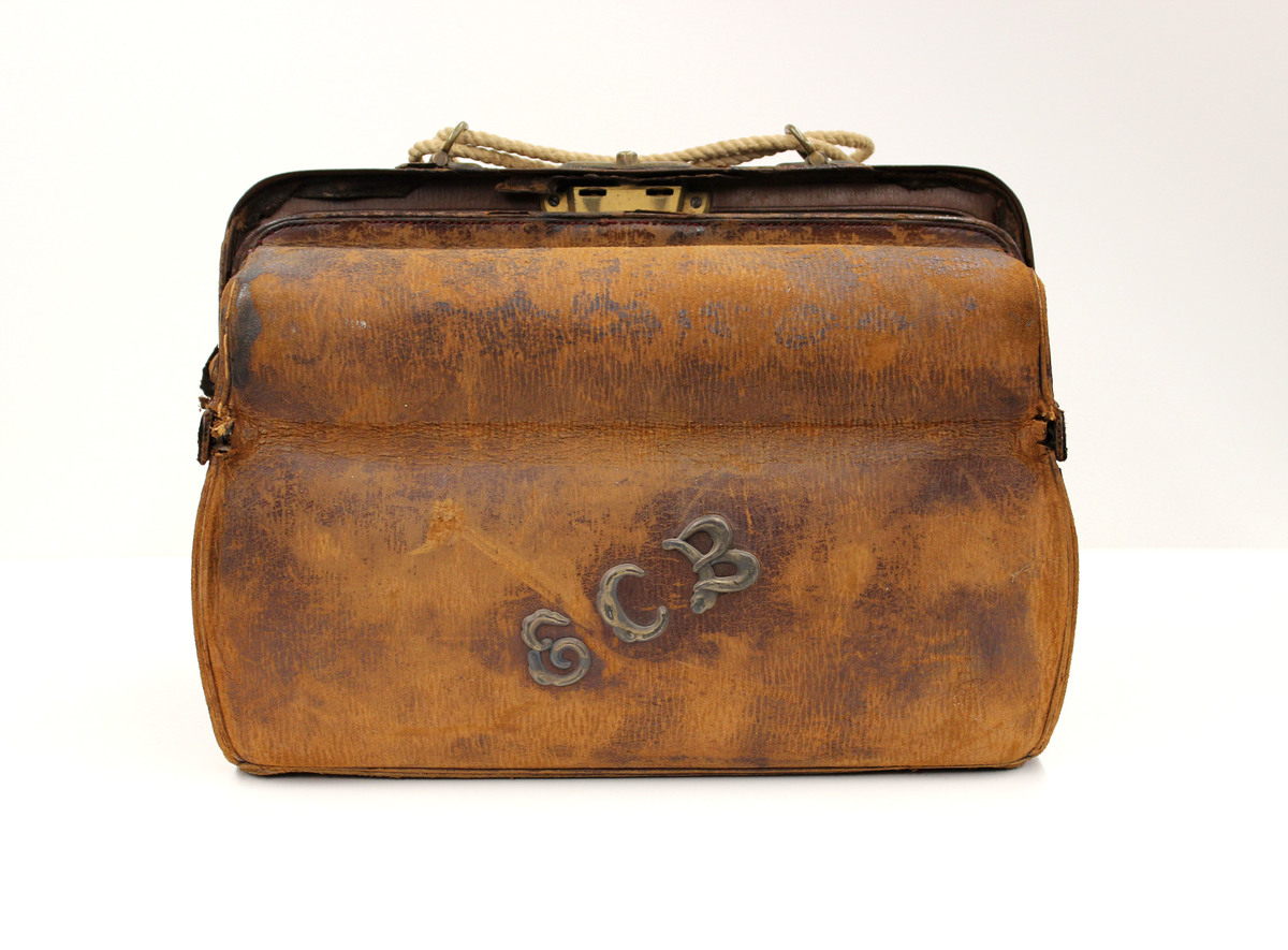 Brown leather doctor's bag, plain with no pockets. Hinged lid in two pieces. Lid reinforced with metal around edges. At the center on one side of the lid is a brass closure with a button release. Two brass rings attached to lid, one of either side of closure. Bag lined with dark green silk. Attached to front of bag are metal letters "ECB." Short length of thin rope tied through rings on lid.