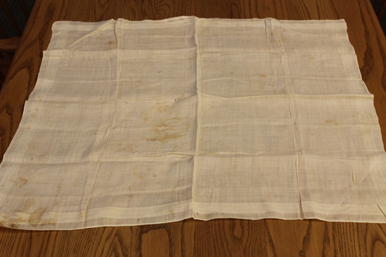 White cotton handkerchief - material thin. Two ends selvage and two ends hemmed. Border on each side of three fat lines with five thin lines in between fat ones. "A Thompson" written in ink in one corner.