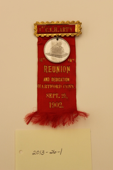 Three-piece G.A.R. reunion medal. Gold metal bar pin with part of the red silk ribbon woven through it with printing: "1ST C.V.H. ART'Y." Bottom of the bar pin has a suspended round silver medal with one side a cannon monument and the other side the seal of the state of Connecticut. From the bar pin and behind the silver medal is a red satin ribbon with fringed bottom with gold lettering: "14TH AN'L / REUNION / AND DEDICATION / HARTFORD CONN. / SEPT. 25, 1902." Stamped mark at back and top of ribbon.