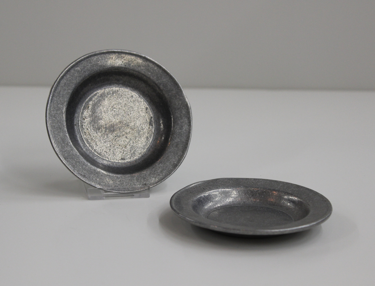 Two pewter dishes used as toys or child's play dishes, marked on bottom "FREEPORT, PA" with maker's mark "C", possibly for Carson. Fairly deep dish with wide rim.