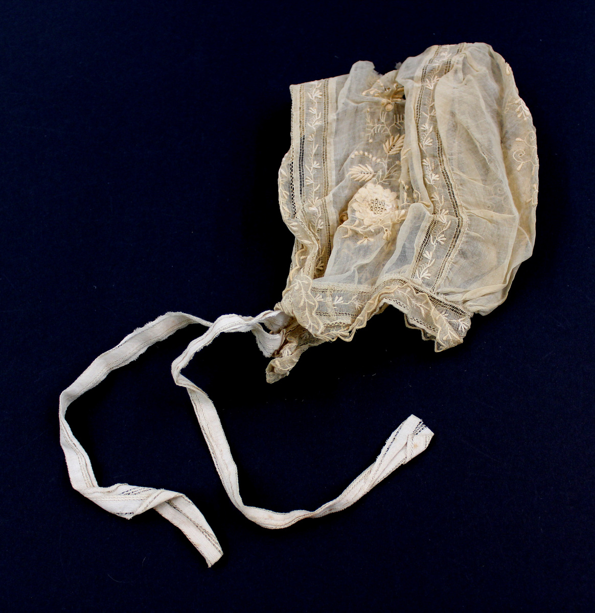 Tan sheer cotton child's bonnet; white work floral embroidery with needle fillings; embroidered band at neck; cotton fabric tape ties