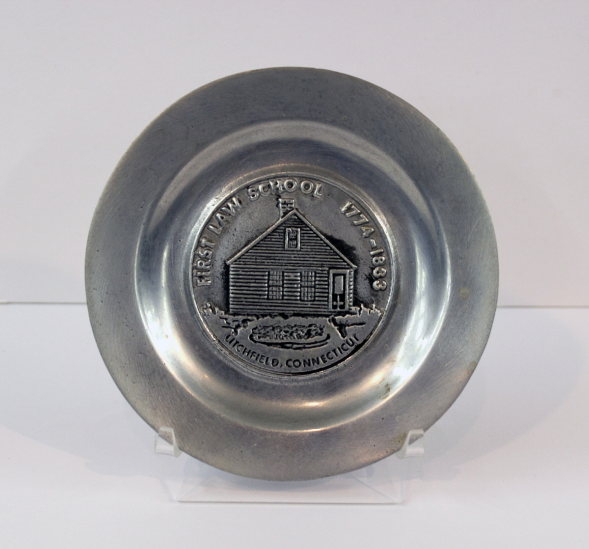Pewter Plate with indented and raised molded image of building with lettering around image: "FIRST LAW SCHOOL 1774-1833/ LITCHFIELD, CONNECTICUT". Back has embossed: "*(Picture of Star)/PEW-IA-NEX".
