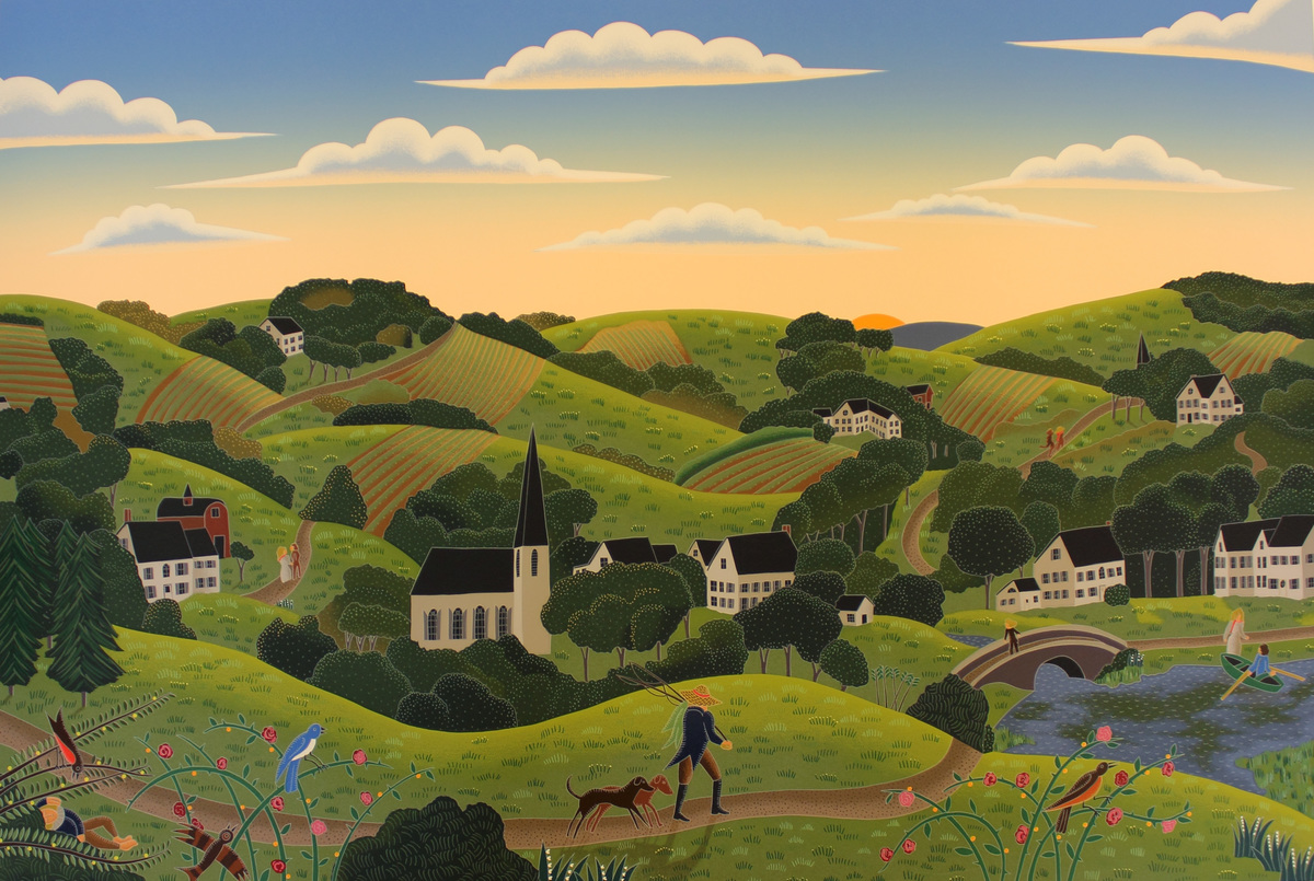 Serigraph print entitled "Connecticut Valley" by Thomas McKnight. Landscape scene showing a town set on a series of rolling hills. Multiple structures visible, including a number of multi-story white houses with black roofs, smaller outbuildings, barns, and a white church with black roof and tall steeple. Plowed fields and paths also visible throughout town. Multiple birds sit on flowers and bushes in the immediate foreground. Behind them, a man with fishing poles walks with two dogs on a path while another reclines in the lower-left of the scene. A figure rows a boat in a lake or pond to the far right, with a second figure waiting on shore and a third crossing a stone bridge that passed over a river leading from the lake. Multiple other figures visible in the distance. The landscape meets the skyline about 2/3 of the way up the image, with the sun just visible above the hills (either setting or rising). Thin, puffy clouds in the sky. Signed in pencil at lower-right, "McKnight" and marked in pencil at lower-left, "AP 39/50." Stamped in black ink on reverse, "C THOMAS MCKNIGHT/1990." Matted and framed.