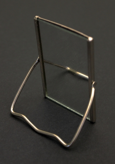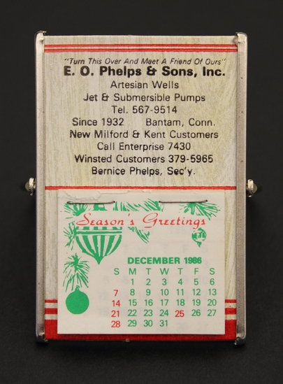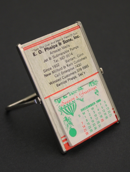 Small upright table-top calendar. Rectangular cardboard piece printed in red and black. Reads, "'Turn This Over And Meet A Friend of Ours'/ E.O. Phelps & Sons, Inc./ Artesian Wells/ Jet & Submersible Pumps/ Tel. 567-9514/ Since 1932 Bantam, Conn./ New Milford & Kent Customers/ Call Enterprise 7430/ Winsted Customers 379-5965/ Bernice Pehlps Sec'y." Paper tearaway calendar below text. Cardboard piece and calendar set into a metal stand with mirror on back.