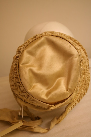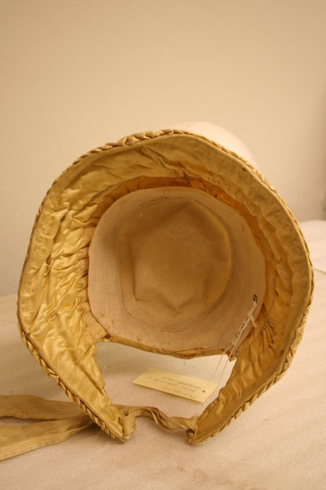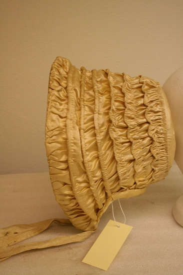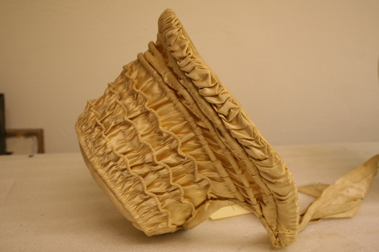 yellow silk bonnet; seven pleats of ruffled material; back flat; brim extends past rest of bottom with two yellow silk ribbons attached to front as ties; interior covered in stiff muslin