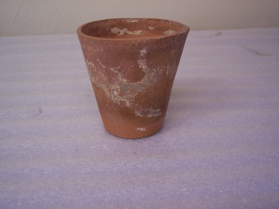 UNGLAZED POT WITH PLAIN RIM AND BASE. BASE HAS CENTRAL DRAINAGE HOLE.