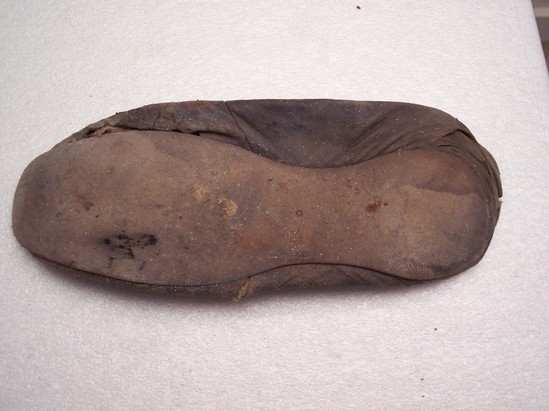 Shoe, brown leather on exterior and on sole. Interior of shoe has layer of linen. Leather sewn together at seams. One iron tack visible on bottom of shoe. Shoe has square toe. Opening of top of shoe measures approximately 6"(l). Two small holes at top of opening where a tie couldbe woven through