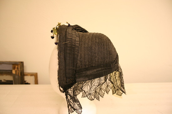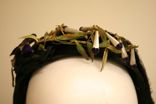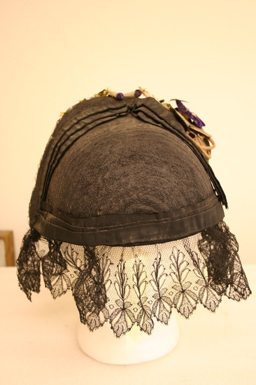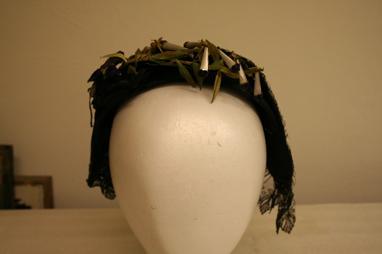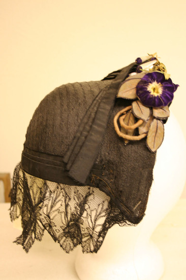 Neopolitan bonnet - only goes half way down head; made of black straw with black lace hanging from bottom edge; black ribbon around bottom edge of base of brim; top of brim decorated with long white with purple top flowers; on open purple flower with yellow center an dlong, thin green/brown leaves; black bow at top left