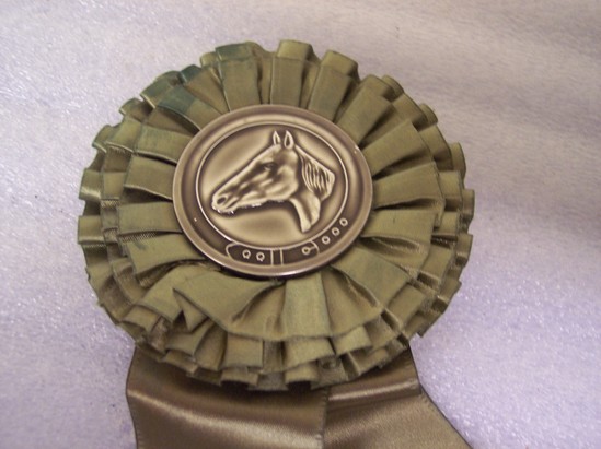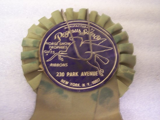 Green silk ribbon. Rosette at top, green with silver medal in center. Horse's head in relief in center of medal. Wire hook on back with makers label glued to back of rosette. Two ribbons extend from bottom of rosette. Printed in gold letters on one "126th Anniversary/of the First Recorded/Litchfield Horse Show" printed in gold on other ribbon "1965"