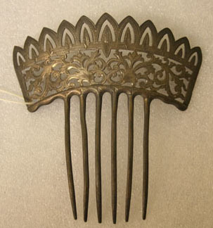 Sterling silver woman's hair comb. Six teeth all the same length - 2 3/4"long. Ridge of comb has molded and pierced desing of floral work with repeating arched border along top of comb. Impressed on back "STERLING" as well as a symbol of two wings with a circle in center and letter "S"