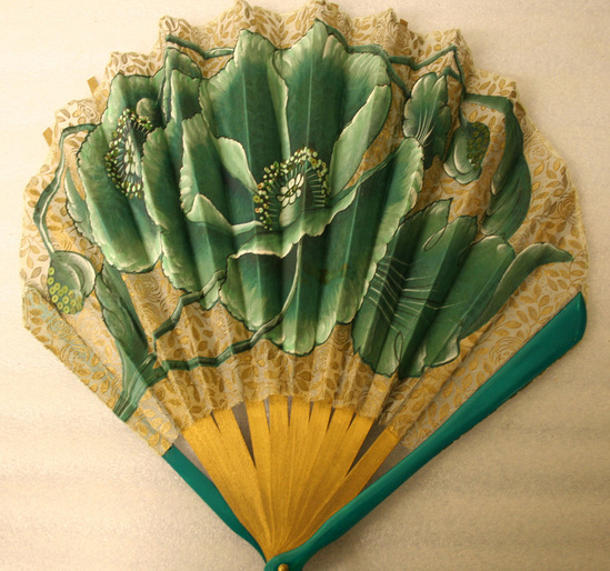 Fan. Wooden stretchers painted gold. Extend length of fan. Both outer sides of fan covered in green plastic. Body of fan made of transparent white gauzee with design of small gold leaves woven into fabric. Exaggerated semi-circualr shape - center being much higher than sides. Oversized green flowers painted on body accented with gold sequins.