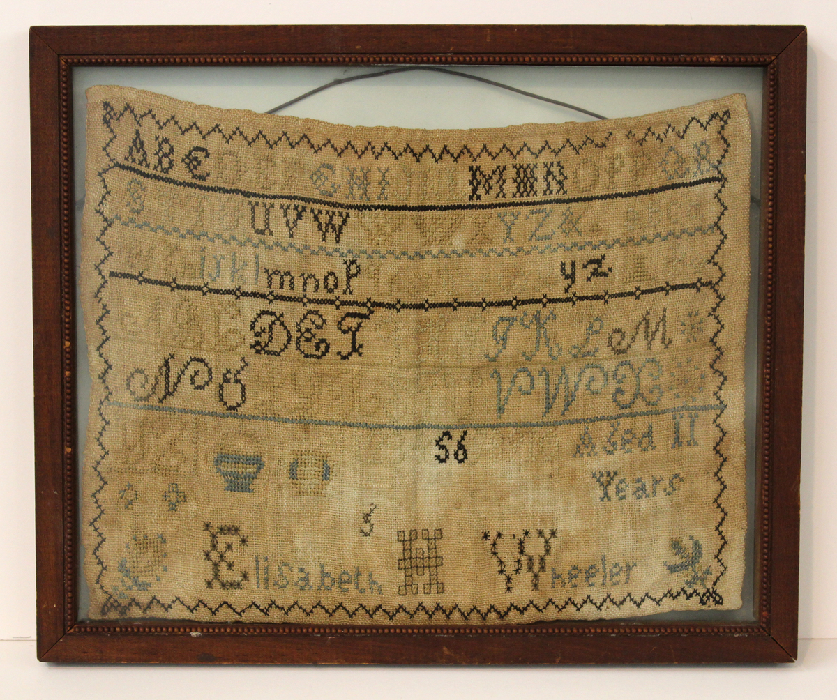 Rectangular marking sampler with black, beige, and light blue silk embroidery on brown linen ground. Border of repeating chevron pattern in black thread, surrounding lines of embroidered letters, numbers, and decorative motifs. Sampler begins with an uppercase alphabet, followed by a lowercase and a second uppercase (different style); each line is separated by a horizontal border in of of the three colors. Embroidery color changes every three letters, following a pattern of black-beige-blue-lighter beige. At bottom, single row of numbers (1-10) with baskets or urns and floral designs. In blue embroidery at right, "Aged 11/Years" and at very bottom, "Elisabeth H. Wheeler" in blue embroidery with the letters "E", "H", and "W" done in larger letters with more complex stitching. Set between glass with simple wood frame.