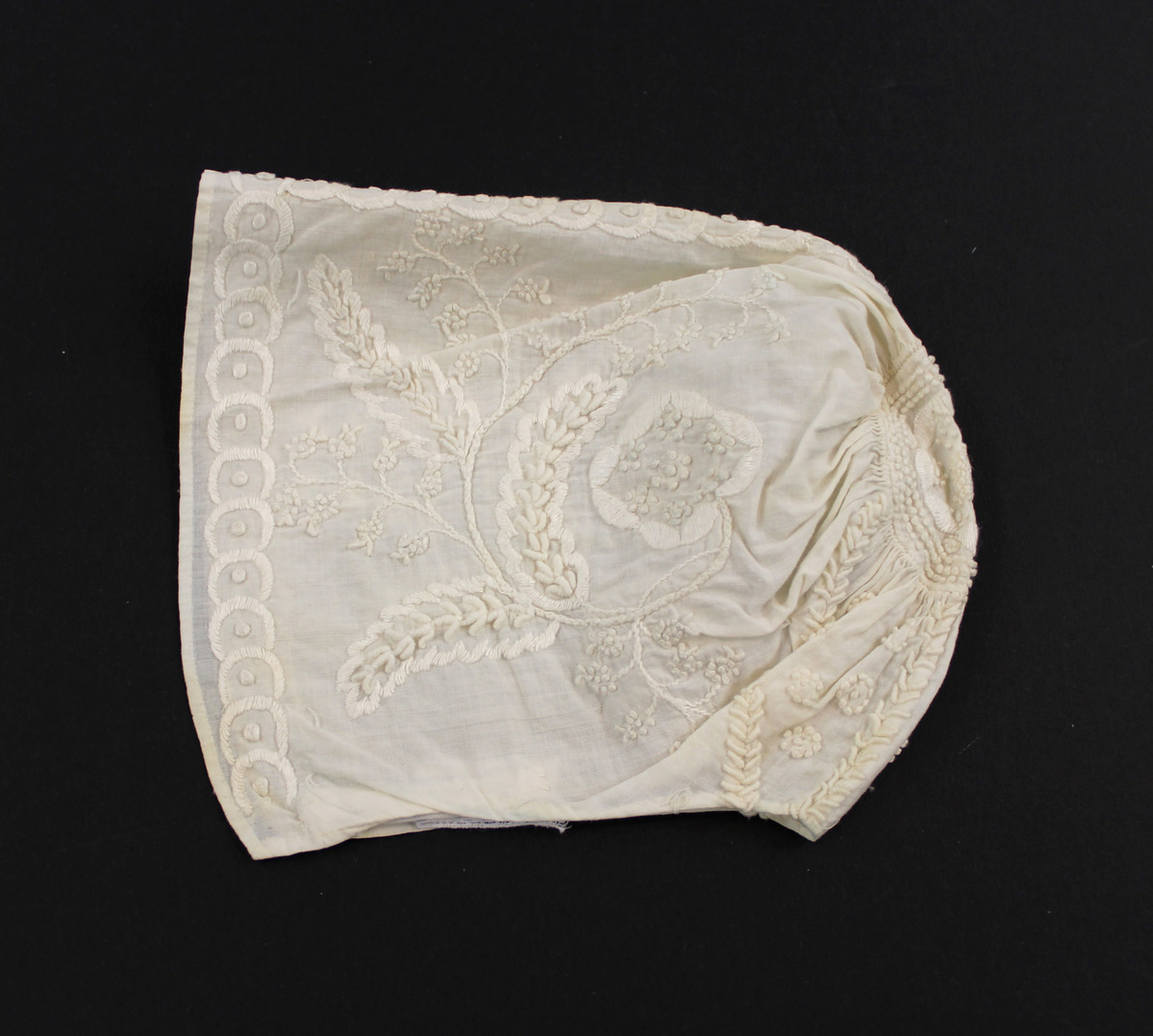 Off-white cotton child's bonnet; white work floral embroidery; circular section at center back