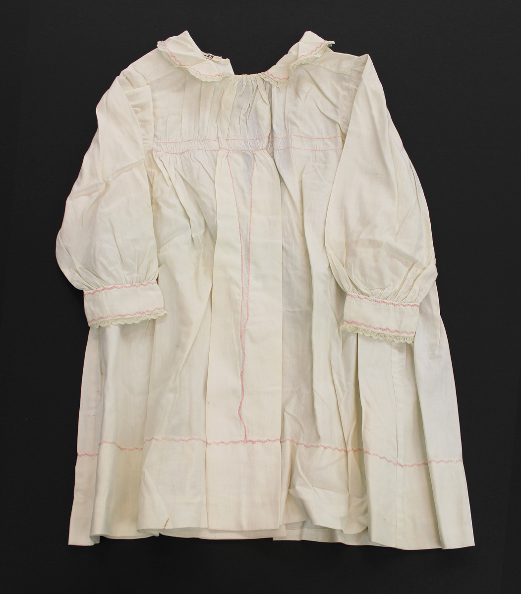 White cotton child's dress; full skirt; full sleeves with tight cuff; round neckline with Peter Pan collar; pink embroidered trim at collar, cuff, hem, waist and vertically down front; center back opening with no closures