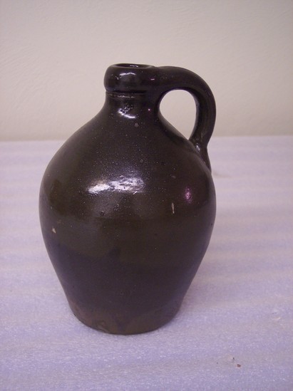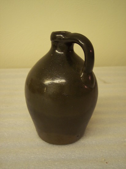 BROWN-BLACK GLAZE WHICH HAS METALLIC SHEEN. PLAIN RIM AND BASE. EAR-SHAPED HANDLE.