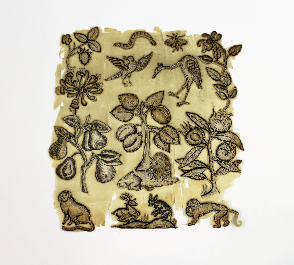 Textile fragment containing wool motifs appliqued to white silk. The motifs are worked in black wool and are meant to resemble engravings. There are ten motifs in total: monkey, rabbit and deer, dog, lion under a plum tree, stork, bird in flight, worm, butterfly, and pomegranate and pear branches. The motifs were either purchased or cut from an embroidered piece.