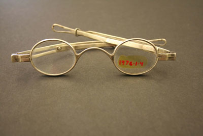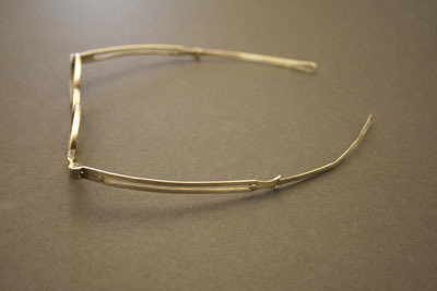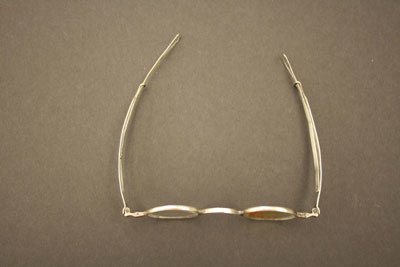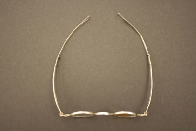 Oval lenses with hinged bows that have sliding upper sections ending in a long tear drop shaped loop. On right ear piece "A.C. Peck" in rectangle and "22" stamped on left ear piece